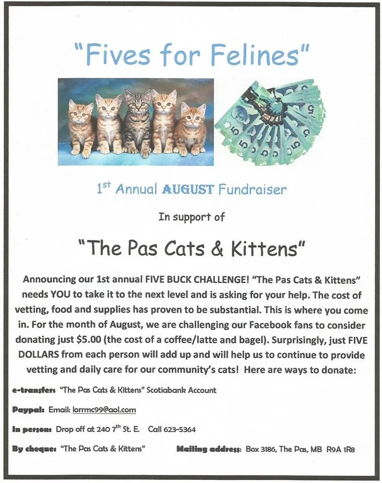 August is "Fives for Felines" month at TPCK. During August, we are asking that you donate just $5.00 to our vet account at the Northern Vet Clinic to help us continue to provide vetting for the shelter cats. We have several kittens that will become old enough to be spayed or neutered this fall. Your dollars can help keep the shelter cats and our vet account healthy!